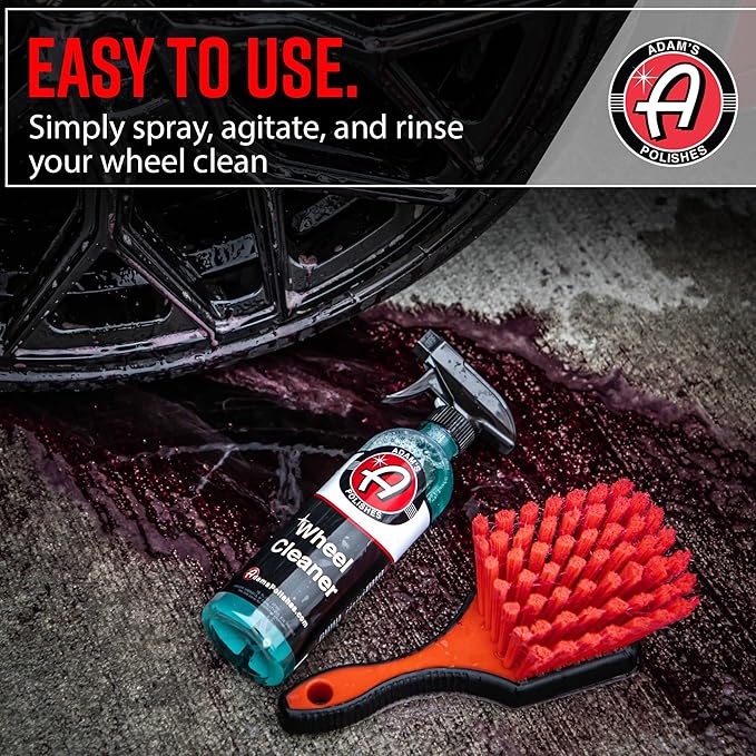 Best of all Adam's Wheel Cleaner is safe for most wheel finishes. Whether you have factory clear coated, aluminum, or painted wheels, the highly effective cleaning solution will remove stubborn brake dust but won't harm your wheels. With the surface cool to the touch, saturate the wheel with Adam's Barrel Brush and allow the color changing formula to activate.