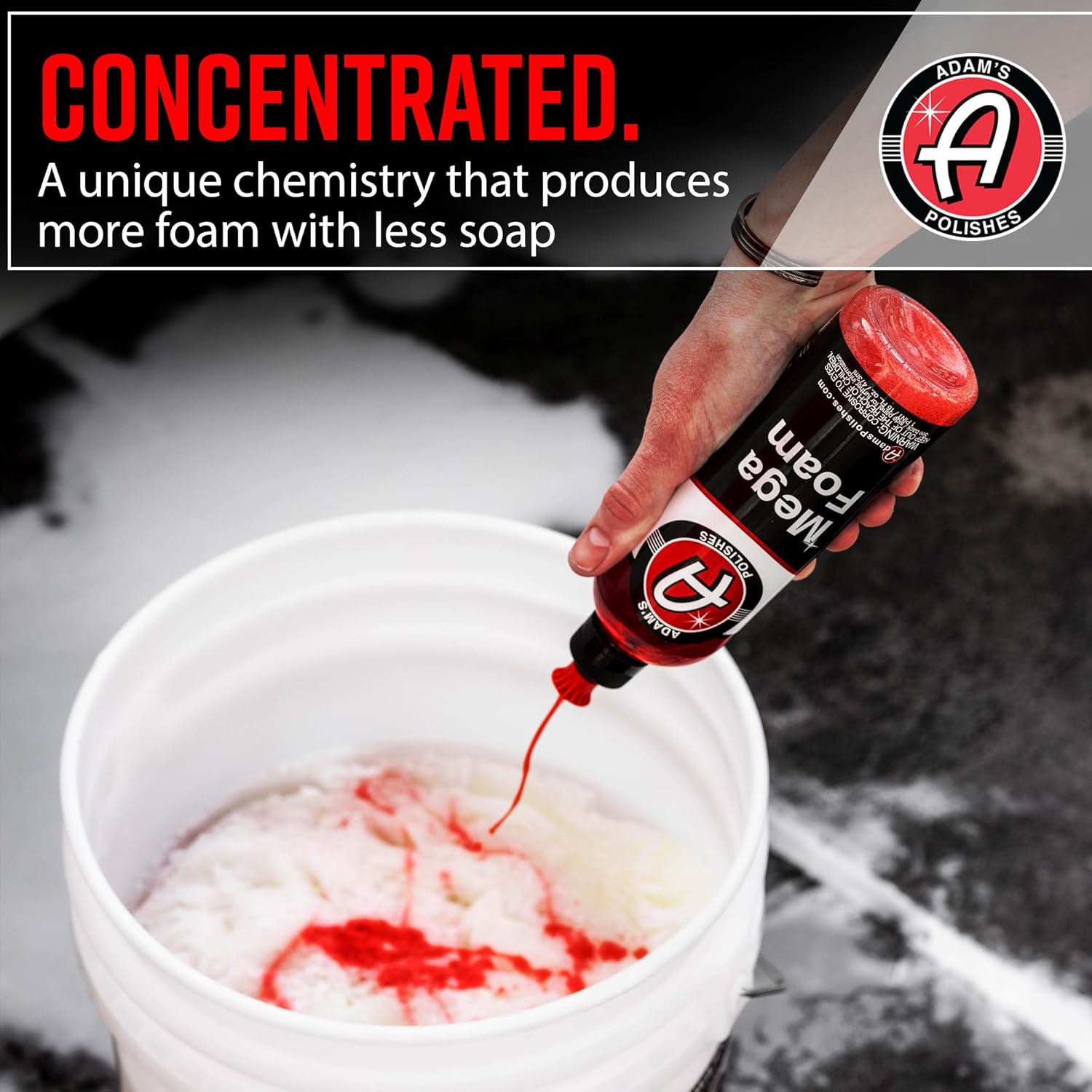 Suds! Suds! Suds! Anytime this question comes up... Who has the sudsiest soap on the market? - We want you to think of Mega Foam Shampoo. Adam’s Product Development Team created this easy to use soap for any detailing enthusiast, whether a weekend warrior or car care expert. For maximum foam potential, pair with the Adam’s Foam Cannon or your favorite foam lance, use in full sun or any indoor setting. For optimal car cleaning results, an effective car wash soap must produce thick luxurious suds that target and eliminates contamination for a spot free finish!